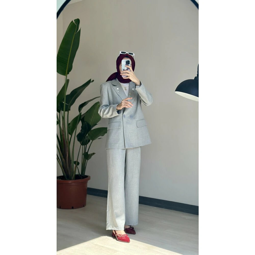 Ceket uzunluk 72 cmPantolon beli pensliYüksel belPamuklu krep kumaşCeket ince astarlıdır