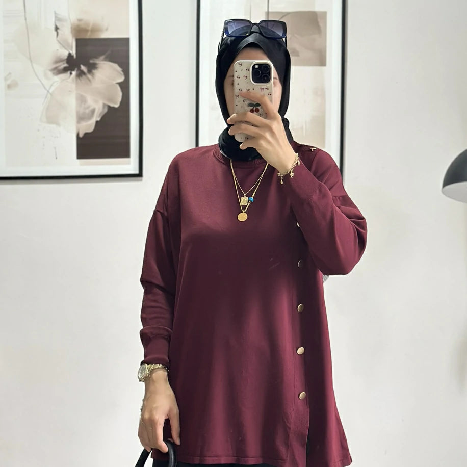 Düğmeli Merserize Tunik Bordo